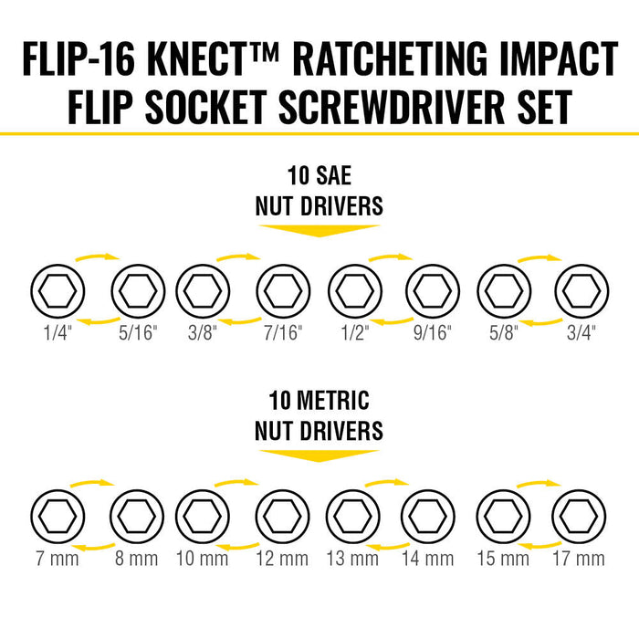 - Impact flip socket set includes 16 SAE and metric sizes combined into 8 color-coded sockets plus three adapters, socket wrench and handle